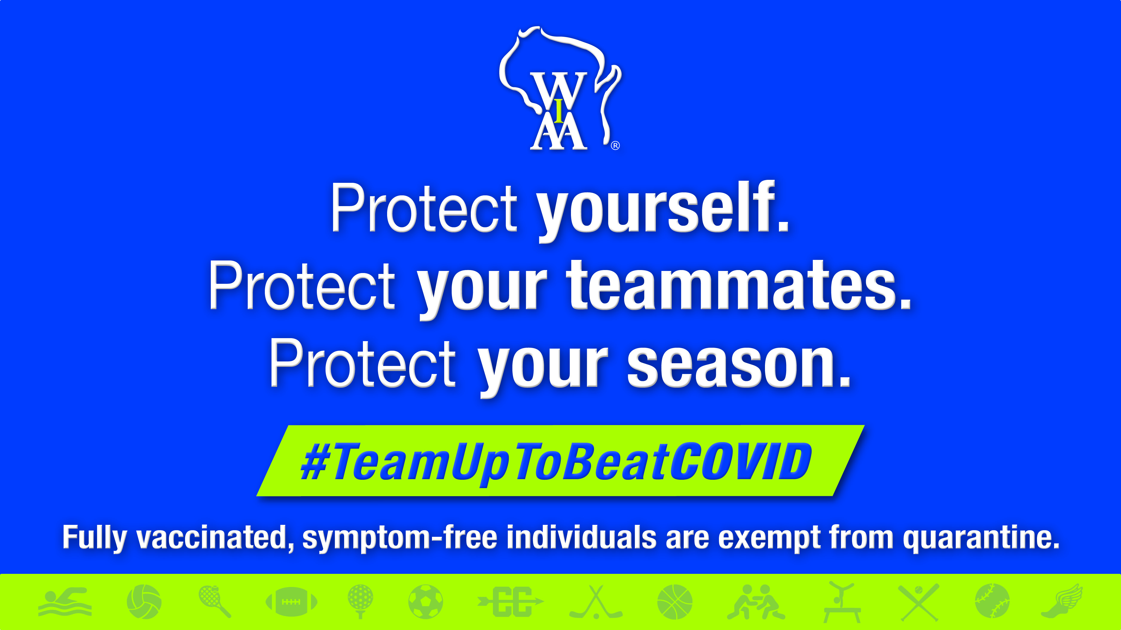 For fall sports, all fully vaccinated, symptom-free individuals are exempt from quarantine. To find a vaccination site near you, visit https://www.vaccines.gov/search/. To review the 2021 WIAA Guidelines for Fall Sports, please access the Health page on the WIAA website and select the COVID-19 resources link located in the menu on the left side of the page.